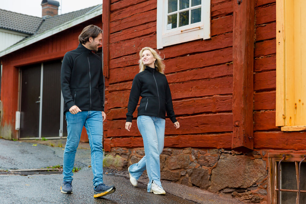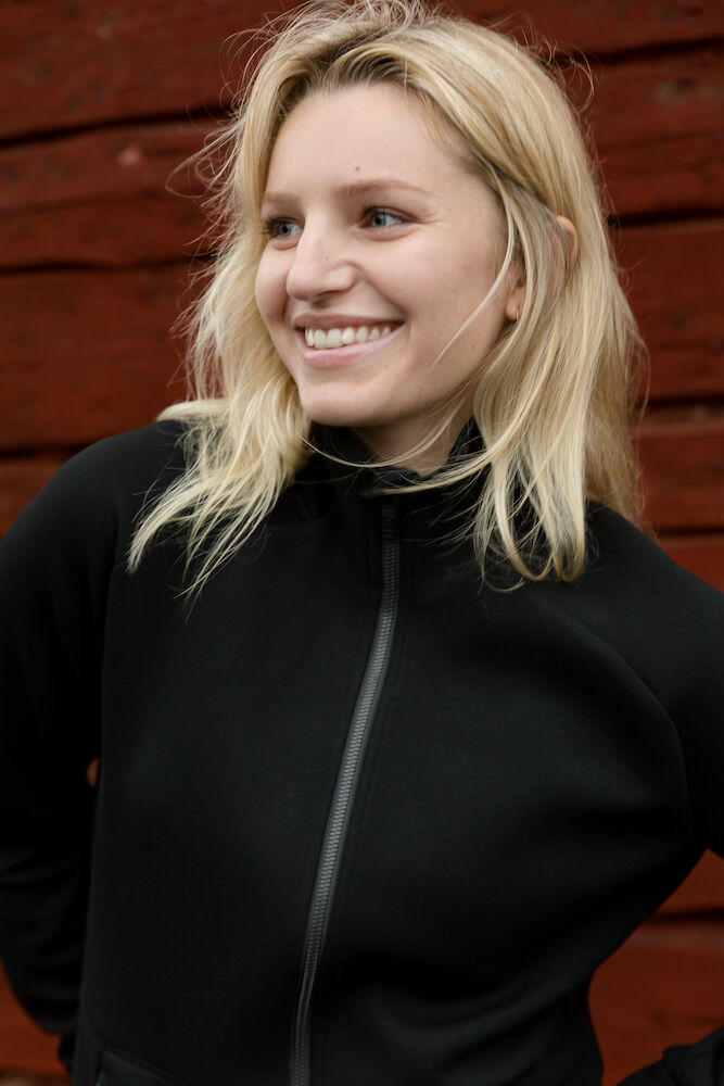 Rozpinana bluza wykonana z materiału o podwójnym splocie z dodatkiem stretchu dla większego komfortu. Ściągacze na końcu rękawów i na dole bluzy. Dwie przednie kieszenie zapinane na suwak. Raglanowy rękaw i przedłużony tył. Prać tylko z podobnymi kolorami.