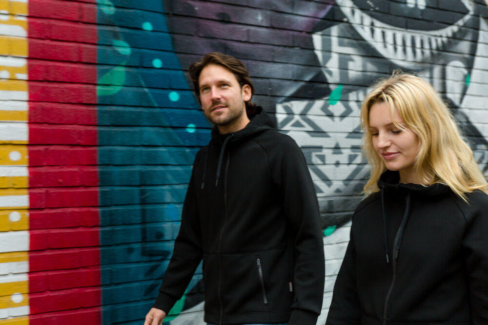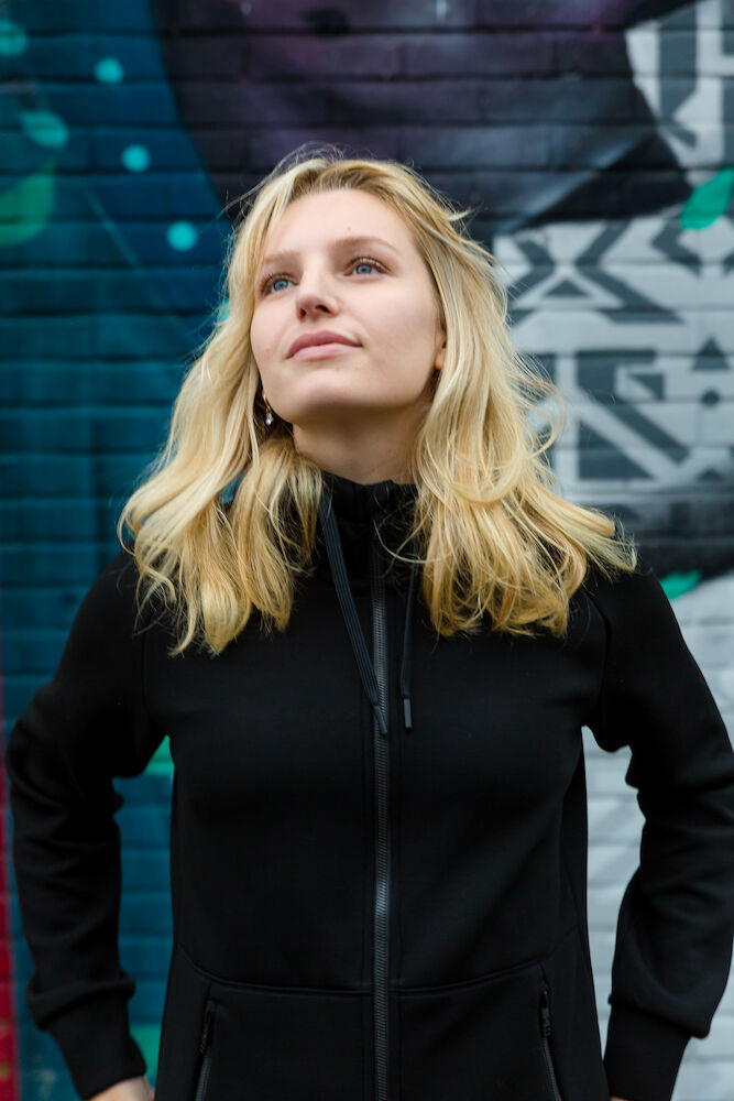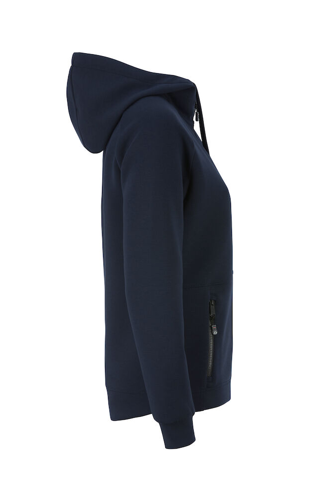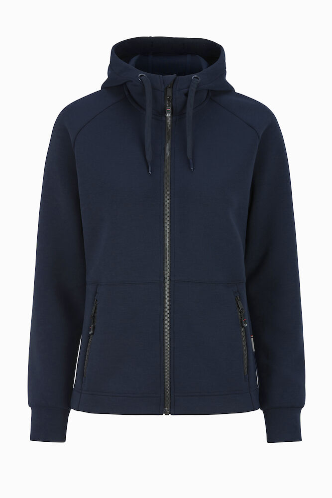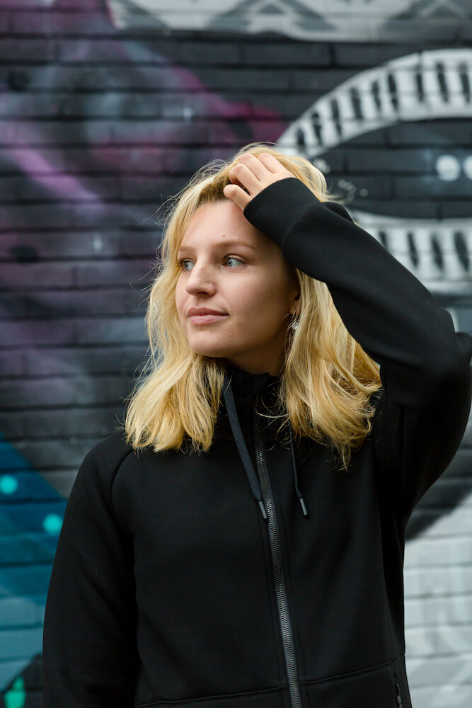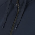Rozpinana bluza z kapturem wykonana z materiału o podwójnym splocie z dodatkiem stretchu dla większego komfortu. Dopasowany kaptur z podwójnymi szwami i sznurkiem. Ściągacze na końcu rękawów i na dole bluzy. Dwie przednie kieszenie zapinane na suwak. Raglanowy rękaw i przedłużony tył. Delikatnie zaokrąglony model.
