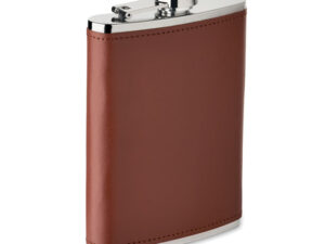 Butelka ze stali nierdzewnej z powierzchnią ze skóry PU i 2 kubkami ze stali nierdzewnej o pojemności 20 ml w pokrywie. Pojemność: 230 ml.