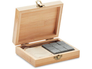 Luksusowy zestaw szklanek w bambusowym pudełku prezentowym do whiskey, ginu, mojito lub innych drinków. Zawiera 2 szklanki (300ml), 8 kamiennych kostek lodu wielokrotnego użytku w bawełnianym etui do przechowywania, w zestawie ze szczypcami. Bambus jest produktem naturalnym, dlatego mogą wystąpić niewielkie różnice w kolorze i rozmiarze poszczególnych elementów, co może mieć wpływ na końcowy efekt dekoracji.
