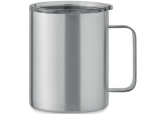 Dwuścienny kubek ze stali nierdzewnej z recyklingu (90% recyklingowanej stali nierdzewnej i 10% stali nierdzewnej) o drewnianym wyglądzie z pokrywką, z zasuwanym otworem do picia. Pojemność: 300 ml.