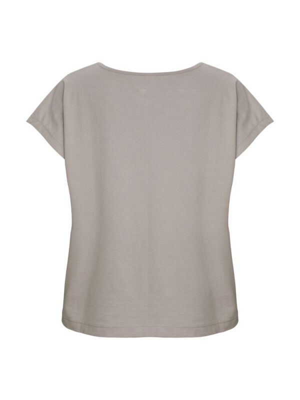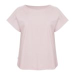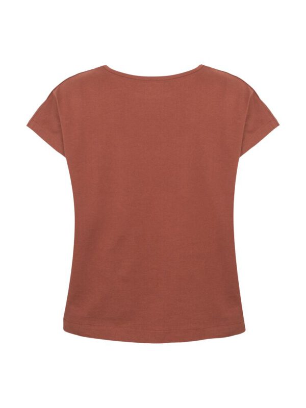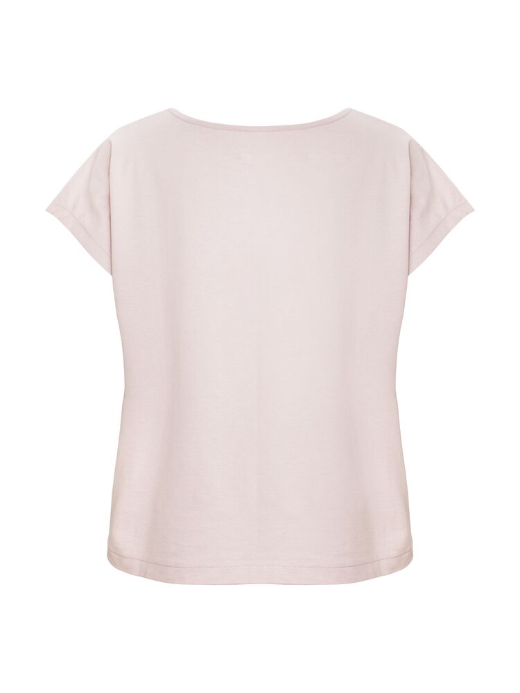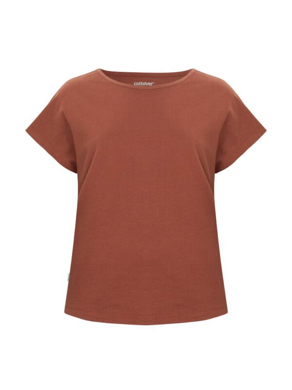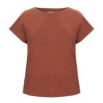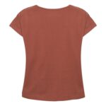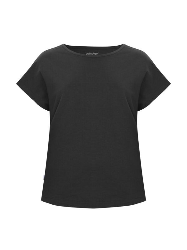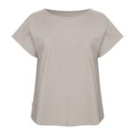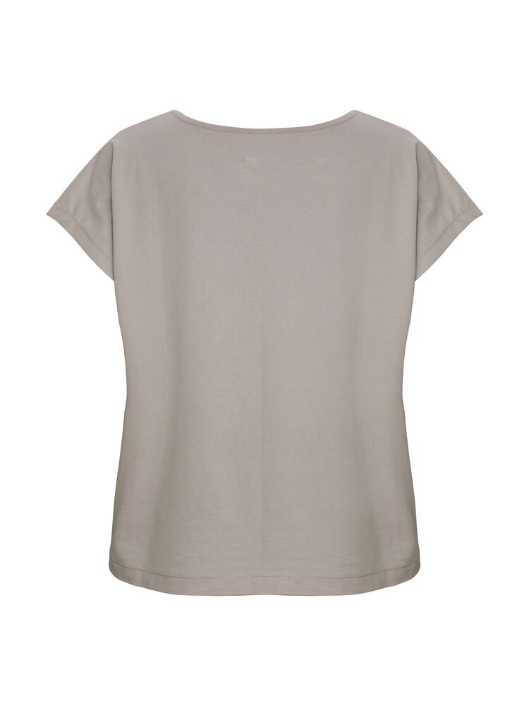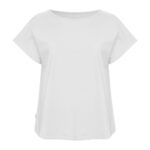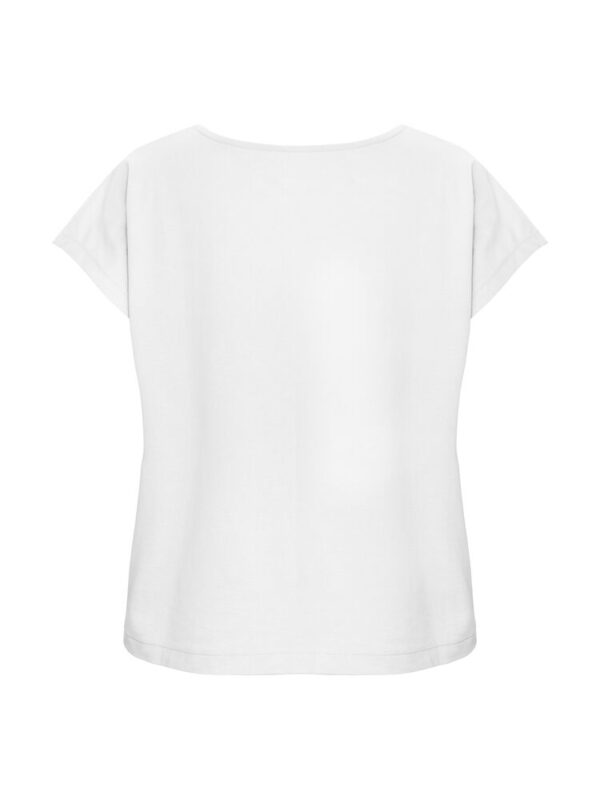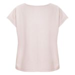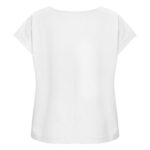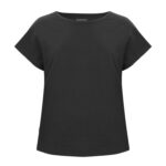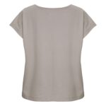 Kobiecy top o luźnym kroju z ładnym układaniem się materiału. Posiada krótkie rękawki i dekoracyjny dekolt w łódkę z lamówką. Nadrukowana metka na karku.