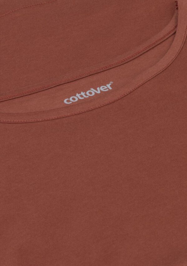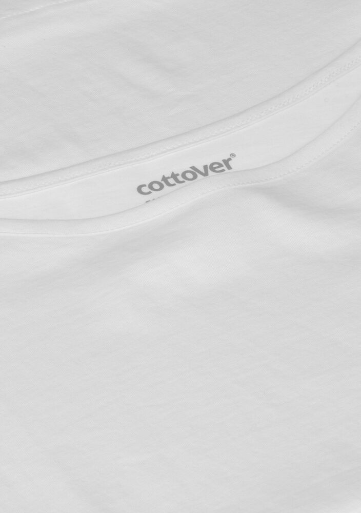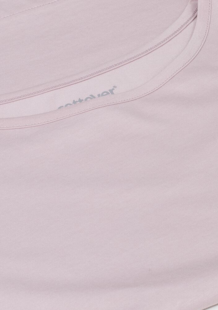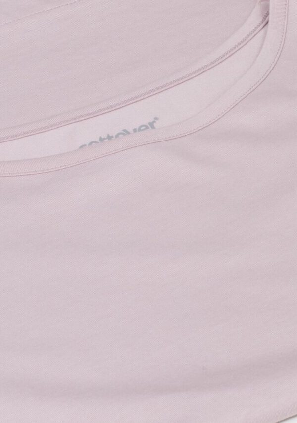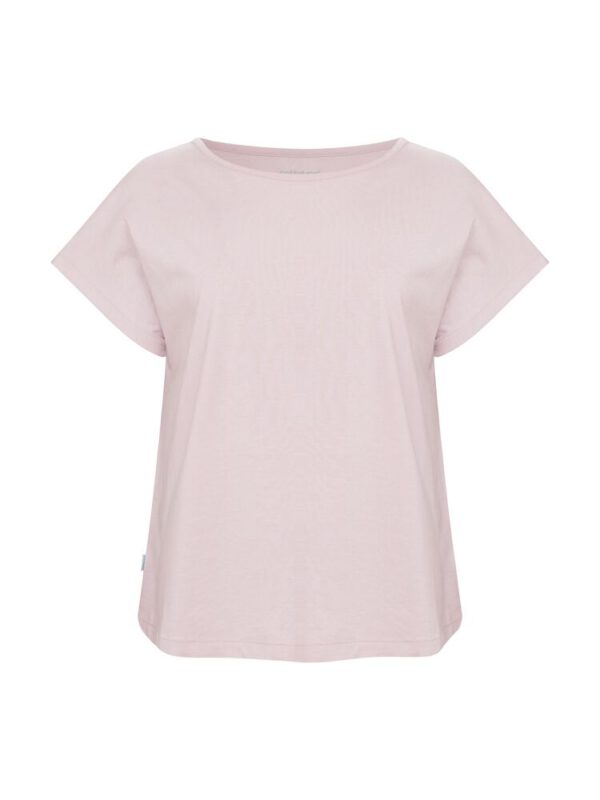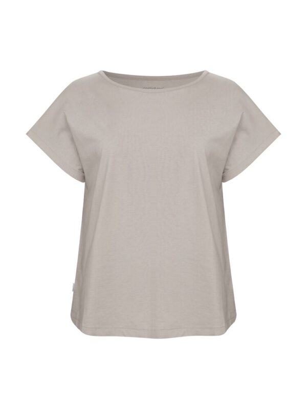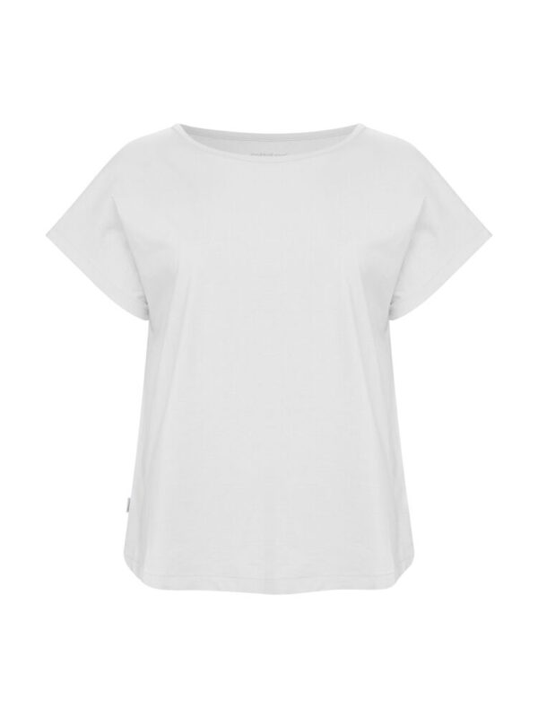 Kobiecy top o luźnym kroju z ładnym układaniem się materiału. Posiada krótkie rękawki i dekoracyjny dekolt w łódkę z lamówką. Nadrukowana metka na karku.