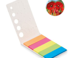 Notes samoprzylepny z miękką okładką z papieru w kolorze trawy. Duże żółte karteczki samoprzylepne z papieru z recyklingu i 5 markerów w różnych kolorach. Po zapisaniu swoich przemyśleń na ostatniej kartce, zasiej pokrywę i obserwuj, jak wyrasta na piękne pole czerwonych maków.